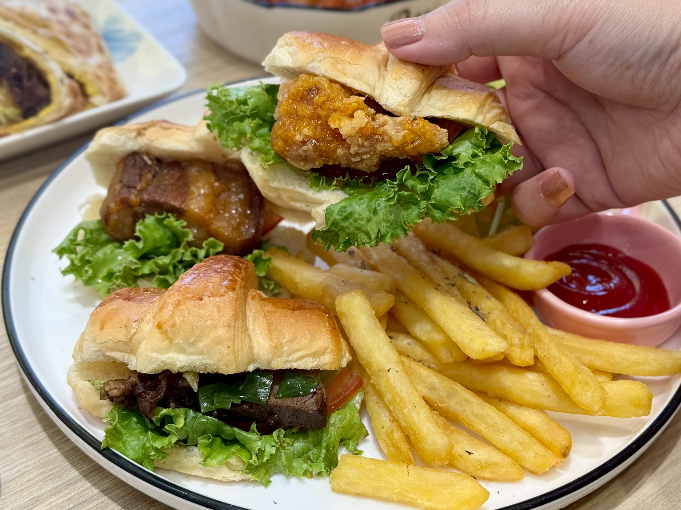 選擇障礙的人可以點這道超可愛的小頌曲套餐,結合三種招牌特色,滷牛腱、秘汁焢肉、橙醬炸雞,小可頌層次分明又酥脆,還帶有濃郁的奶油香氣,每一口都是不同的滋味, 搭配新鮮生菜沙拉和薯條小朋友也很喜歡