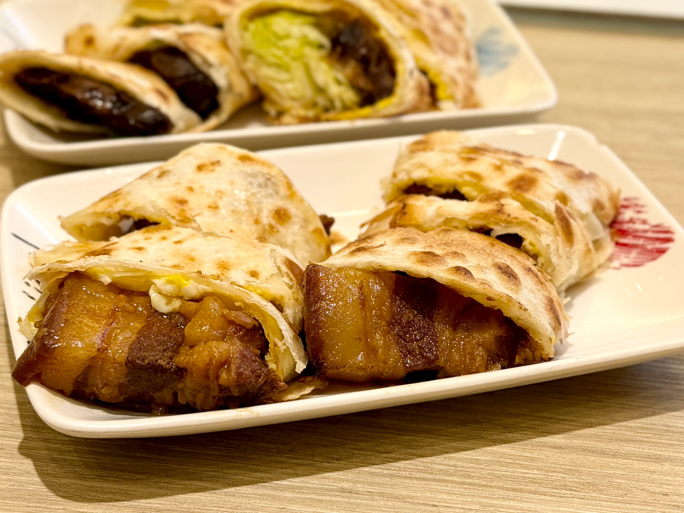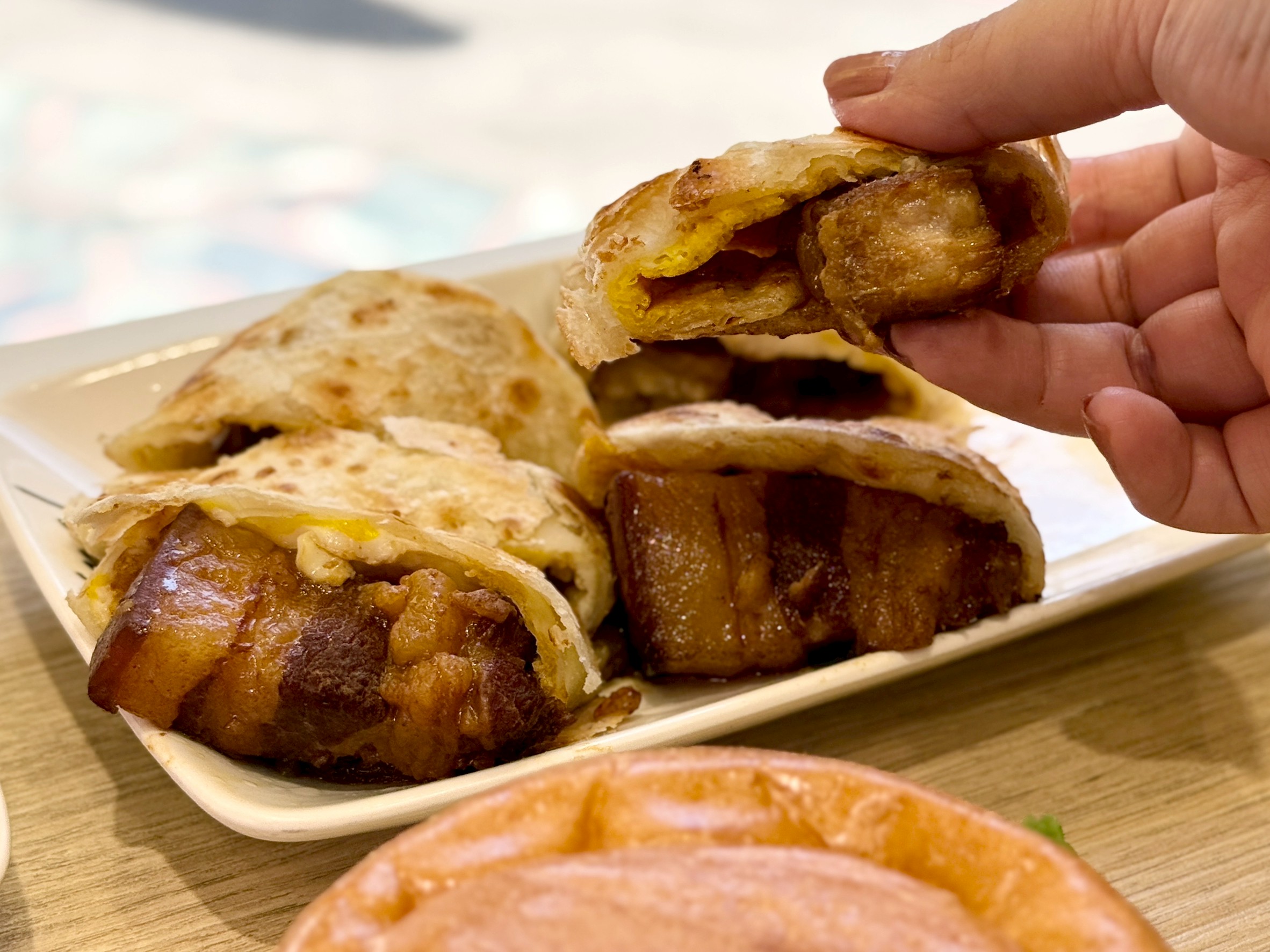 台式古早味焢肉融入千層蛋餅,我本來就很愛焢肉沒想到這邊有焢肉蛋餅的組合,焢肉經過長時間的慢火細滷,達到油脂入口即化、蛋餅皮則是選用外層酥脆、內層Q彈