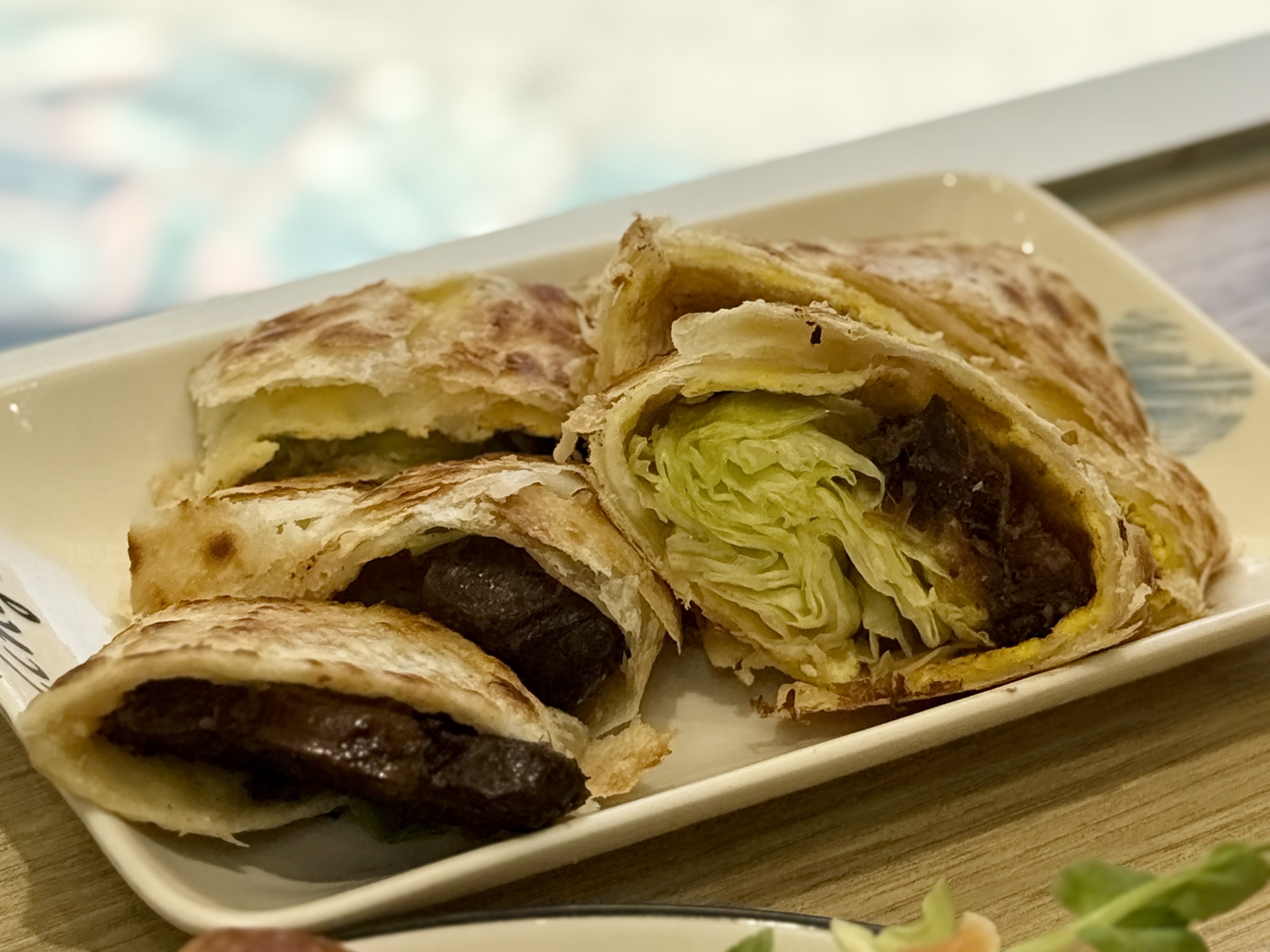 當你一口咬下,蛋餅的酥脆包裹著焢肉的滷汁與油脂瞬間釋放,口感層次豐富,鹹香入味