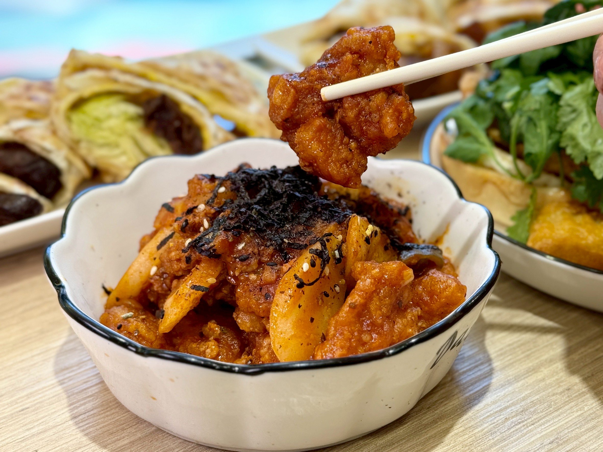 現點現做的肉醬辣炸雞,是用現炸酥脆雞塊搭配自家熬煮的濃郁肉醬,香辣中帶點甜味
