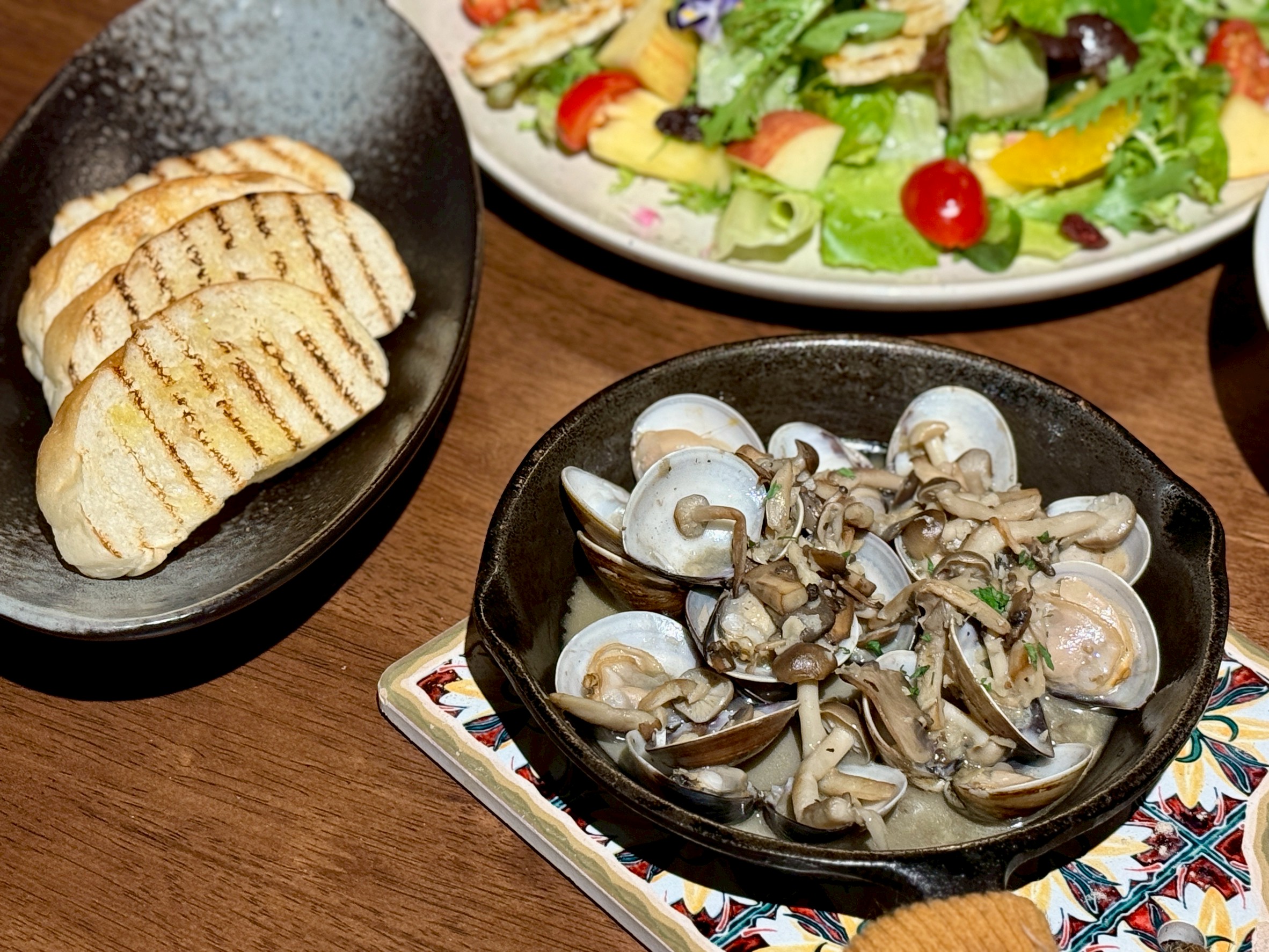 開胃菜蒜味白酒蛤蜊搭配菇類,鹹香開胃,還有附上剛烤好的麵包可以沾取醬汁食用,而且麵包是可以再續的喔