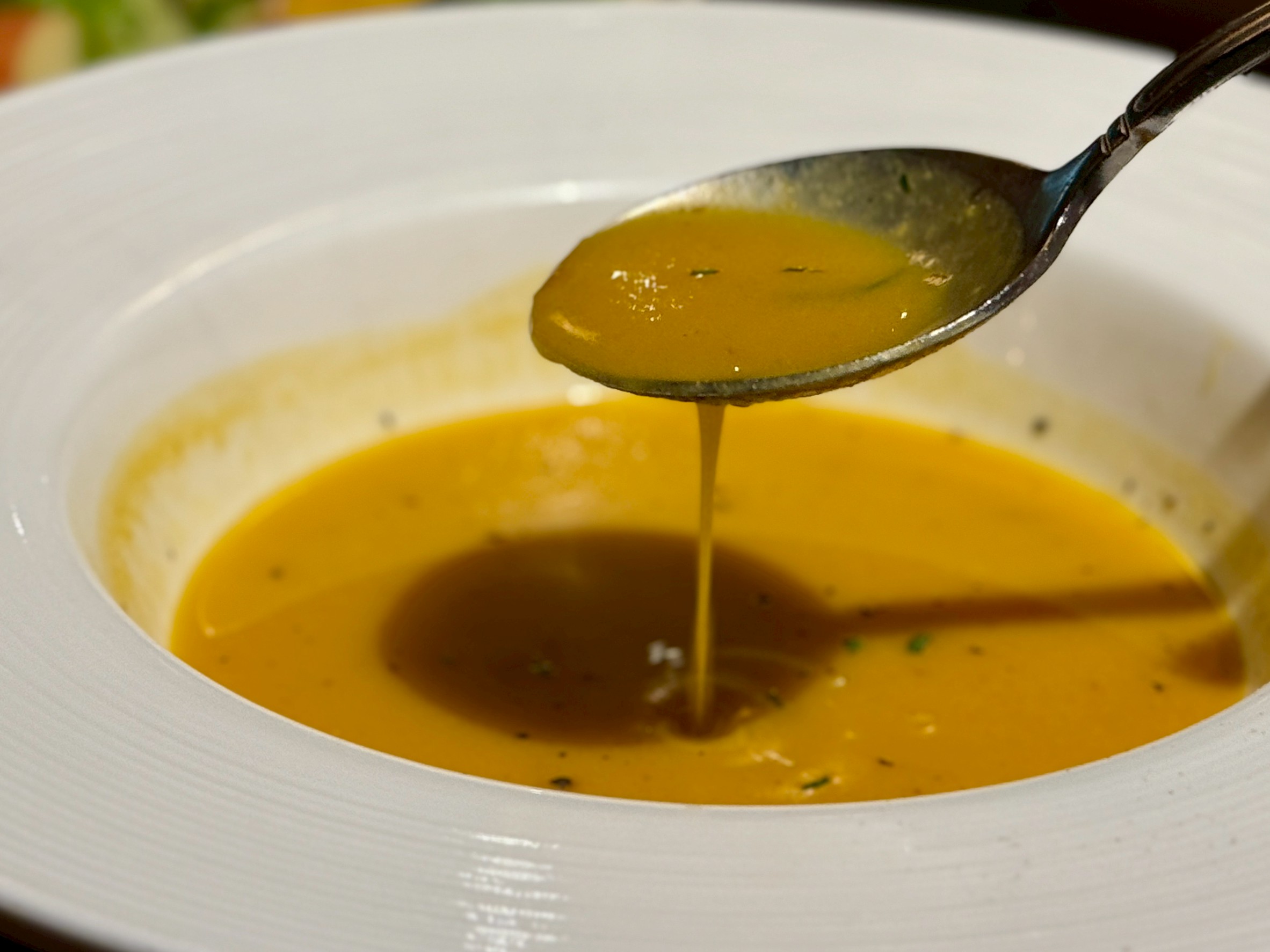 今天來享用的主廚例湯剛好是女兒最愛的南瓜濃湯,喝起來十分香甜