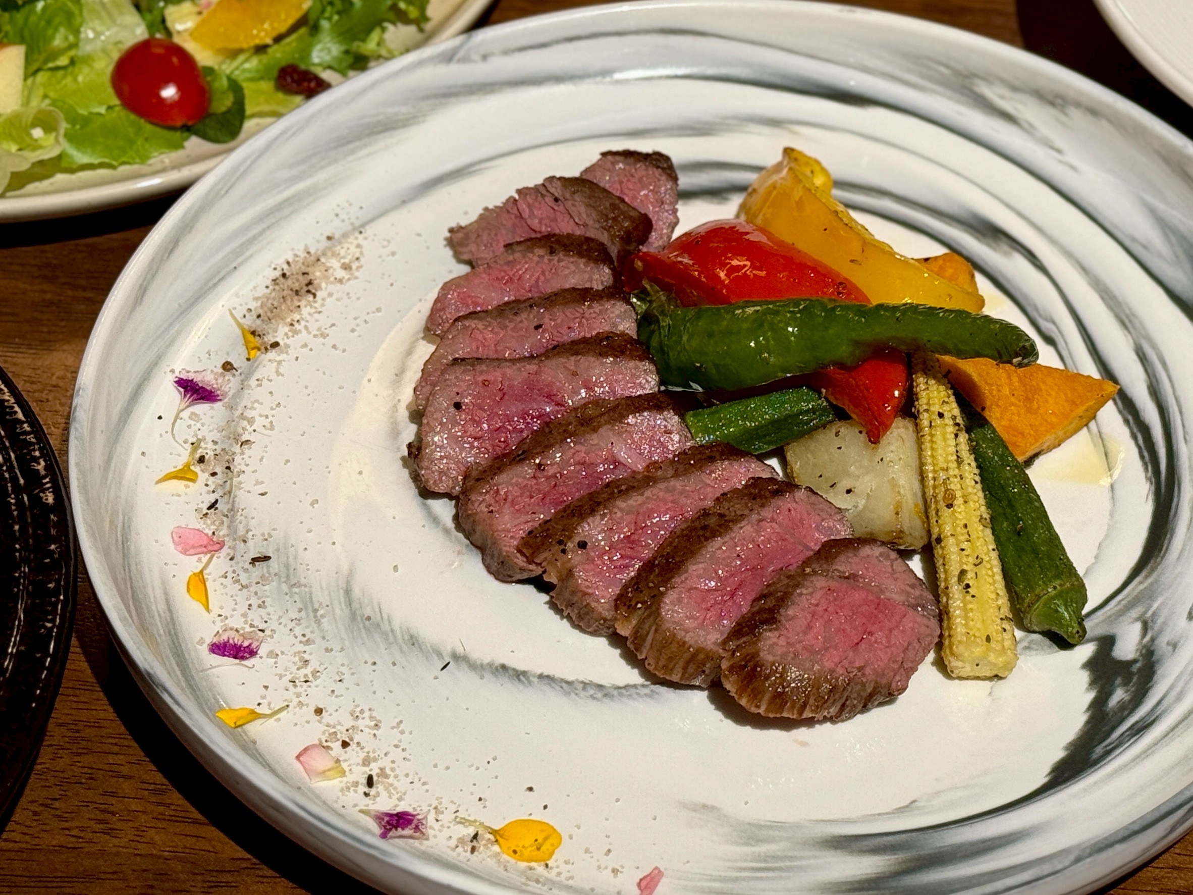 和牛經過爐烤處理,肉質呈現完美的粉紅色。口感軟嫩多汁,但保有紮實的嚼勁,爐烤的火候讓肉品外層帶有微微的焦香,搭配海鹽或醬汁好美味