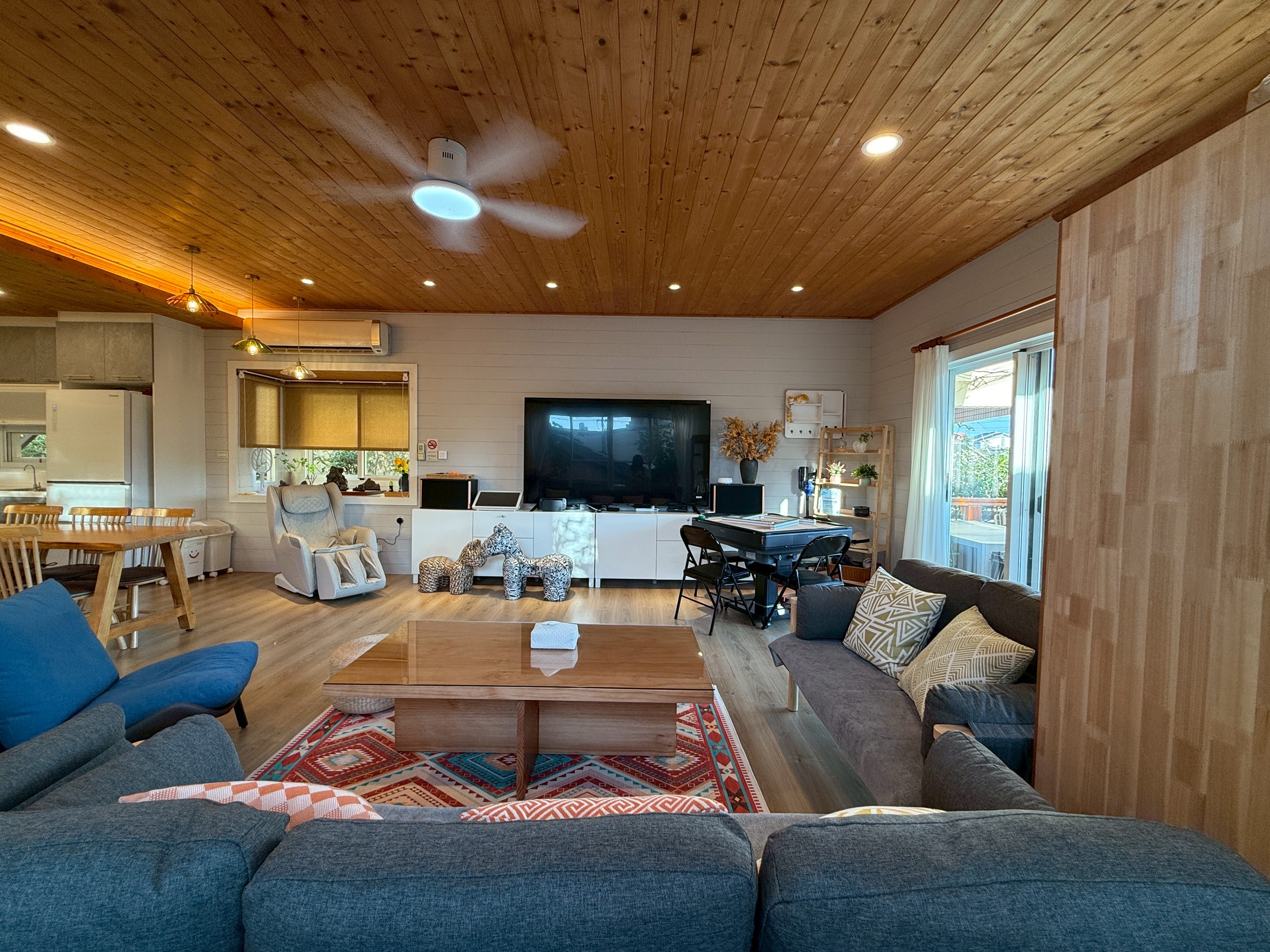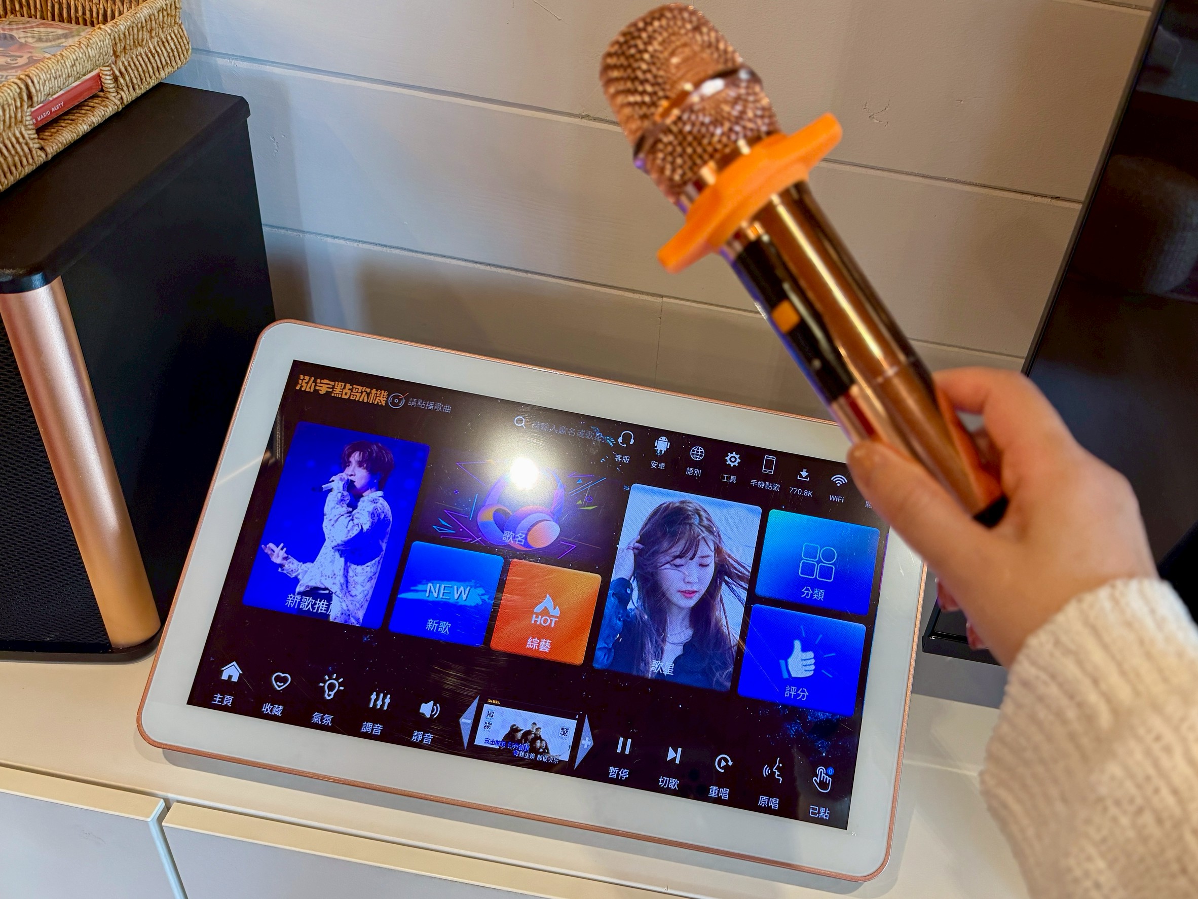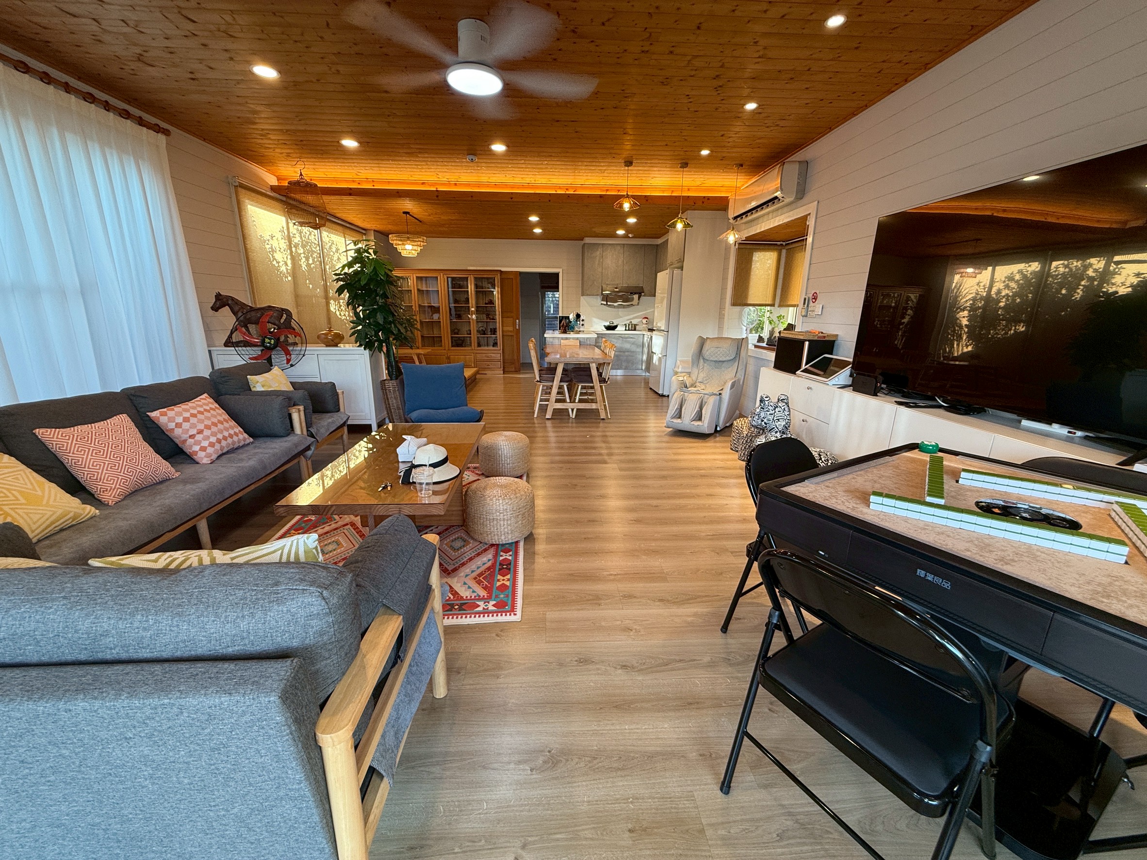 一樓就是大家娛樂交誼的天堂一進來就覺得空間超大有85 吋串流電視、歡唱 KTV、任天堂 Switch 遊戲機、電動麻將桌、按摩椅,讓大家從早玩到晚