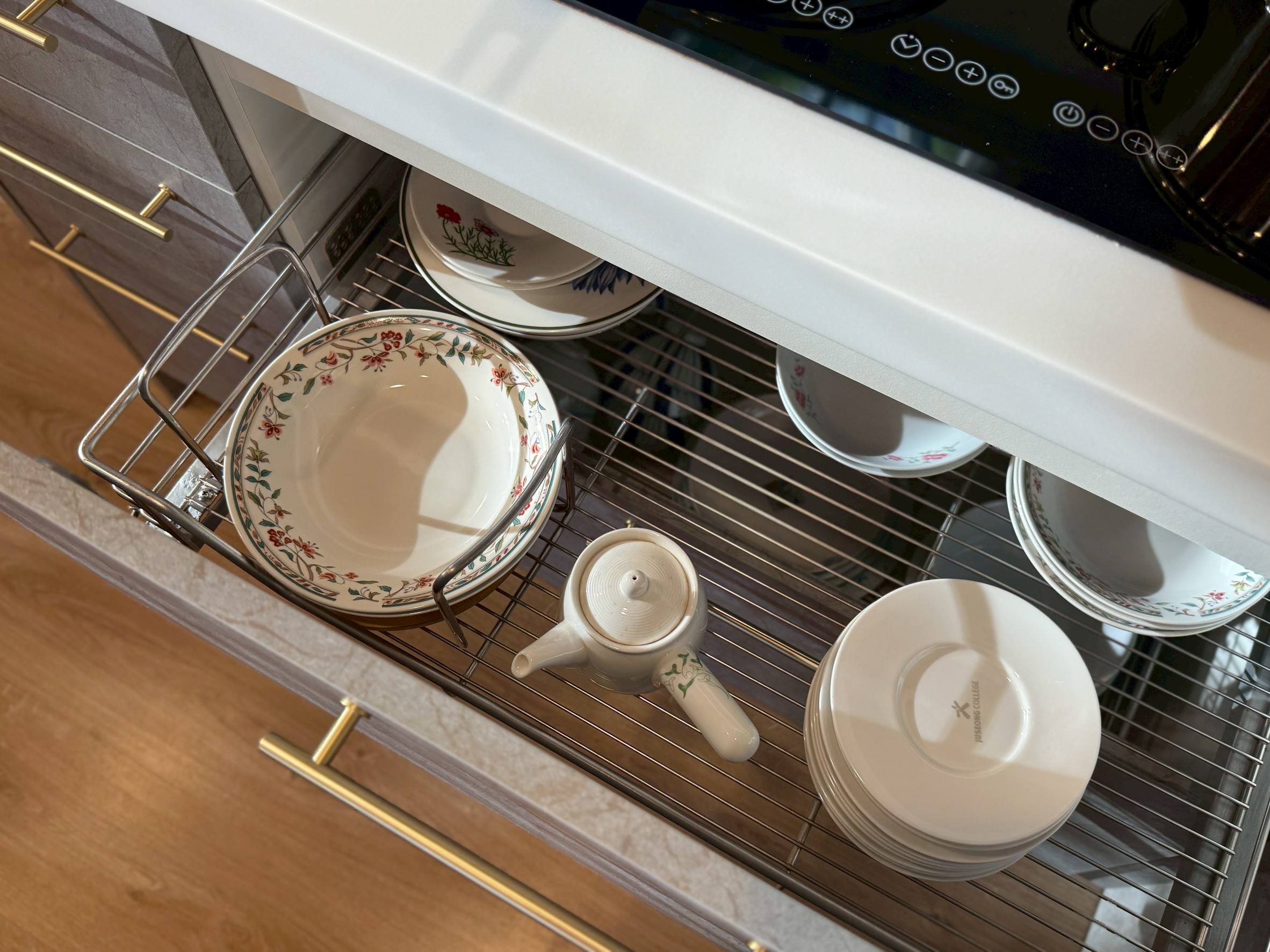 也有提供各式烹飪用具拉開來還有精美的碗盤可以使用