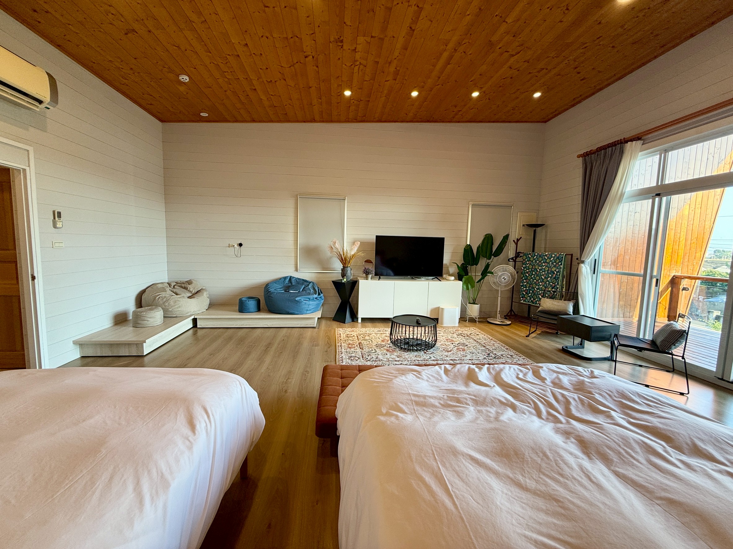 二樓四人房,有雙人床X2、沙發床X2 還有獨立的超大陽台,標準四人最多可以10人